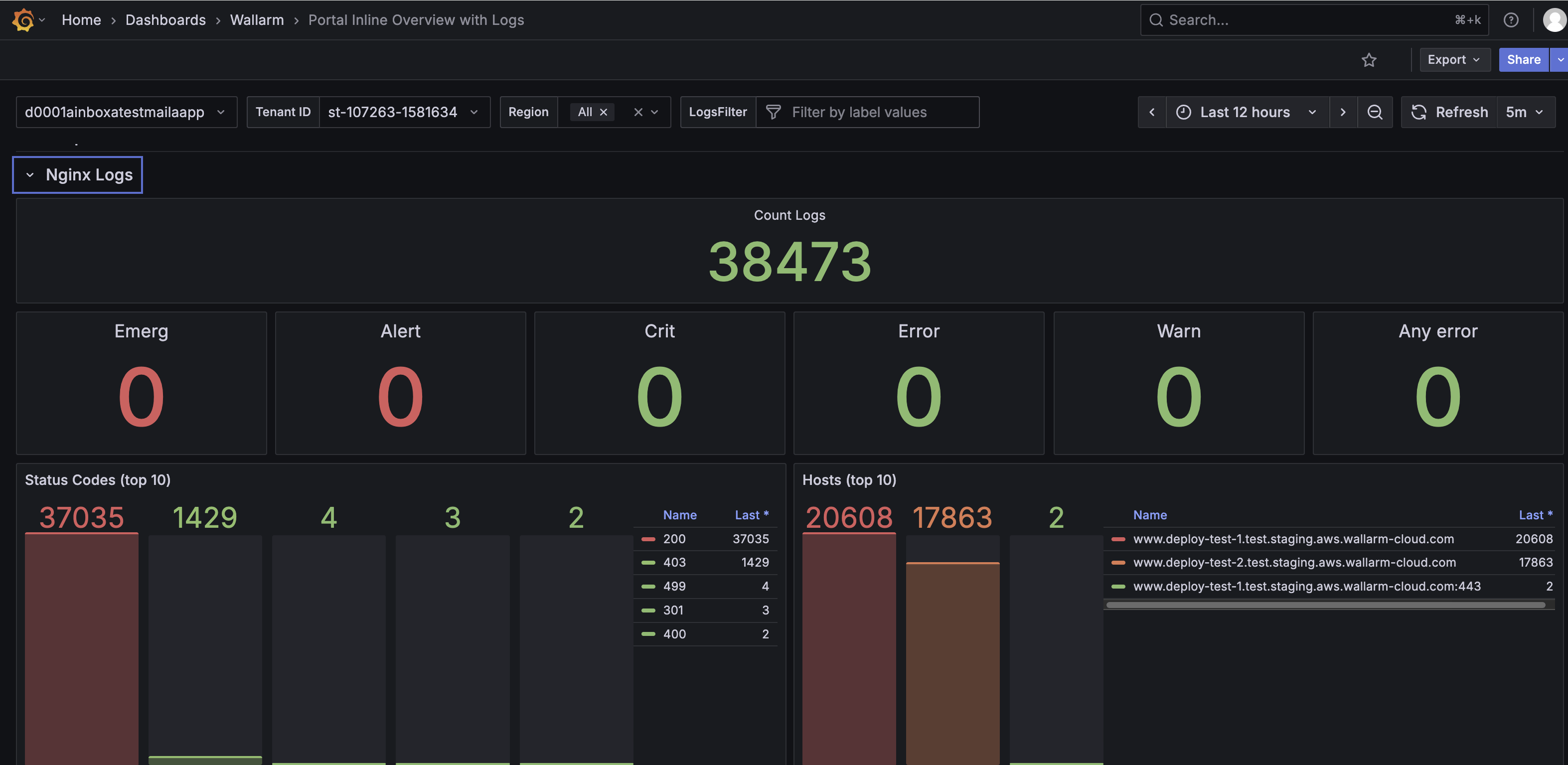 Unlike the dedicated Portal Inline NGINX Logs dashboard, which shows only NGINX error and access logs, the NGINX Logs row presents these logs alongside other key node and Wallarm metrics. This way you can monitor NGINX traffic in context, correlate errors with overall performance, and detect potential issues more efficiently.