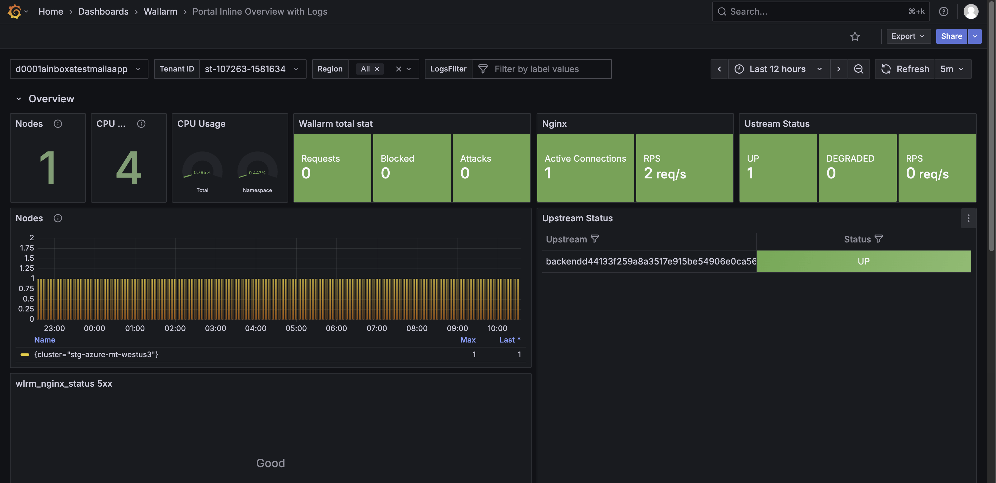 The Overview row provides a summary of the health, performance, and security activity of the Wallarm Security Edge cluster. It includes key metrics about nodes, NGINX, upstream services, and Wallarm request statistics.