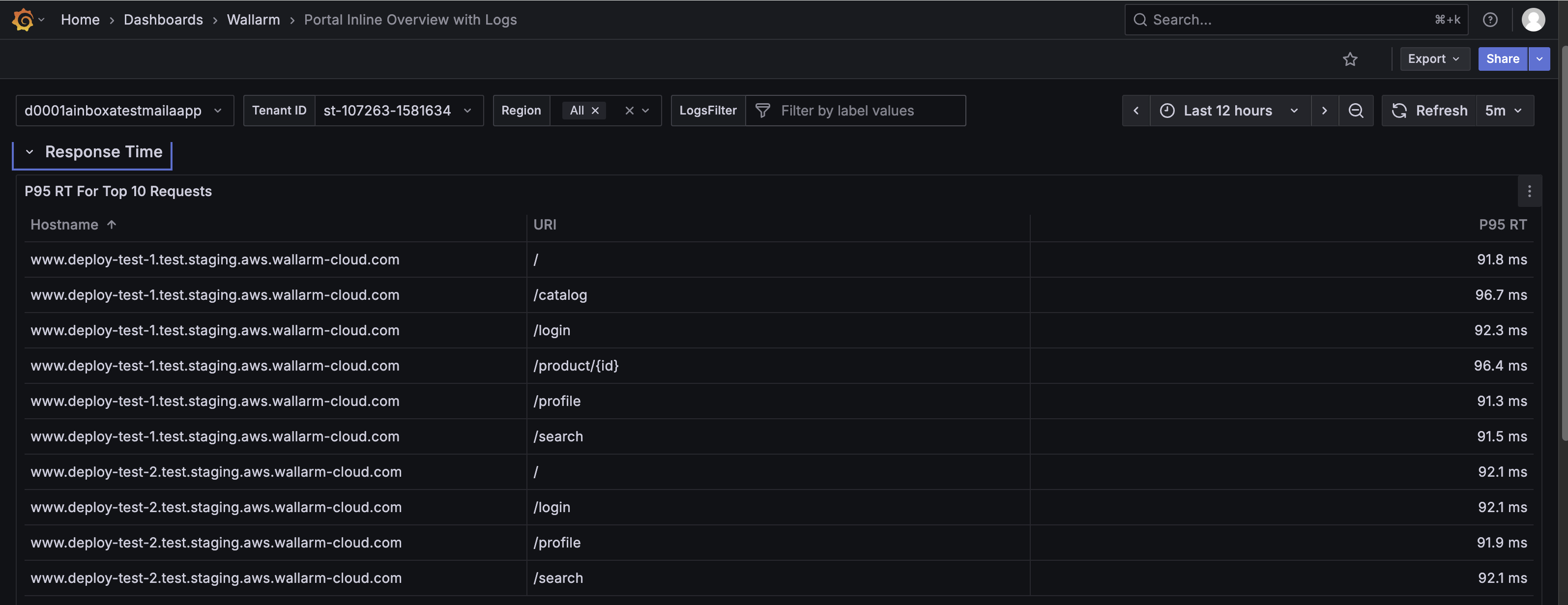 • P95 RT For Top 10 Requests – Shows the 95th-percentile response time (P95 RT) for the top 10 URIs by request volume.
