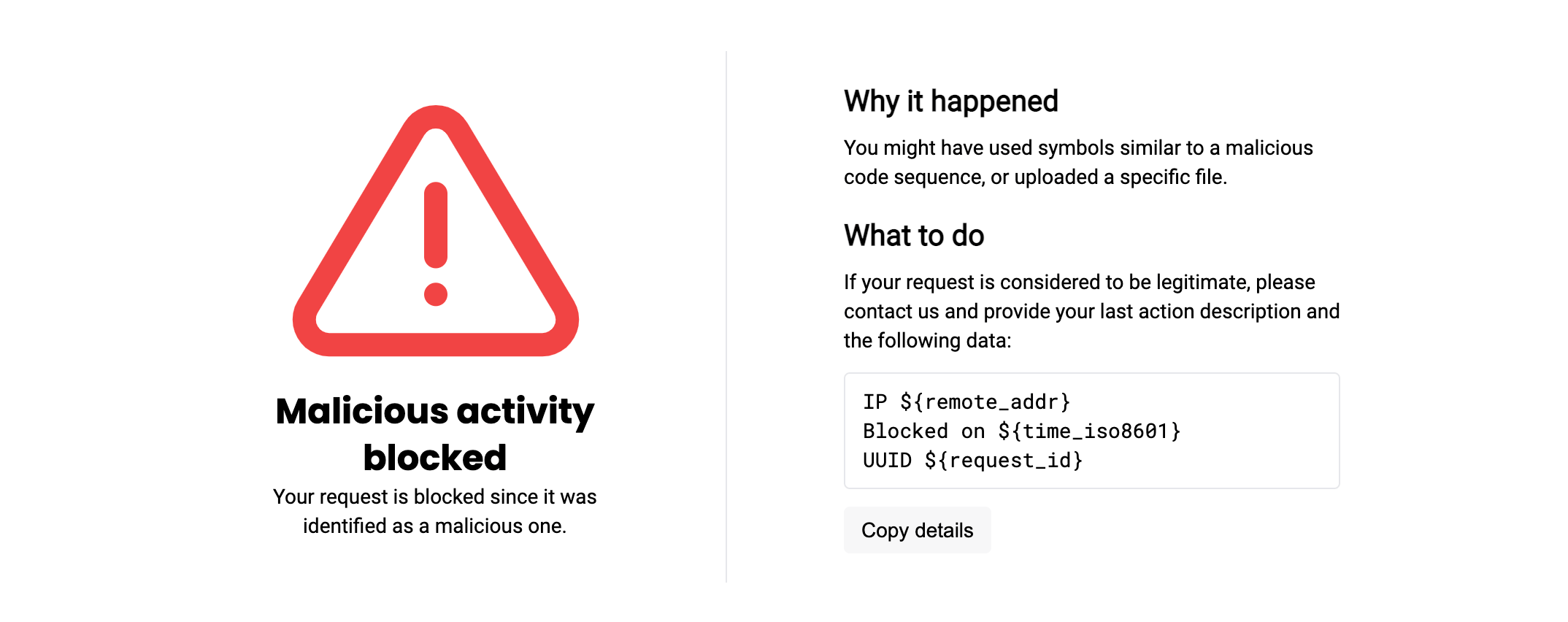 If you do not use the default or customized Wallarm blocking page, it is highly recommended to configure it to get the appropriate info from user. Remember that even a sample page collects and allows easy copying of meaningful information related to the blocked request. Additionally, you can customize or fully rebuild such page to return users the informative blocking message.