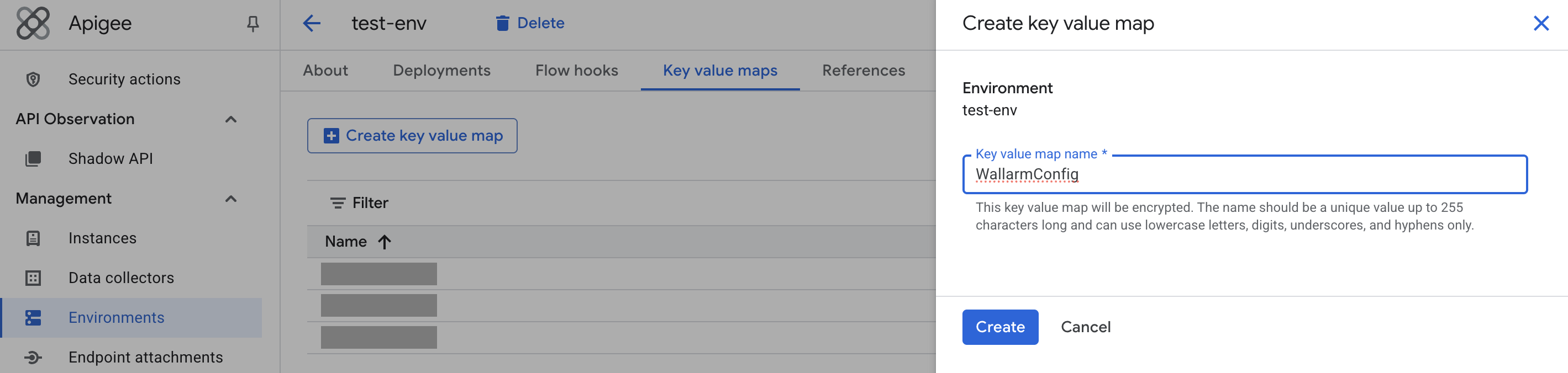 curl -X POST \ -H "Authorization: Bearer $(gcloud auth print-access-token)" \ -H "Content-Type: application/json" \ -d '{ "name": "WallarmConfig", "encrypted": true }' \ "https://apigee.googleapis.com/v1/organizations/<APIGEE_ORG_ID>/environments/\ <APIGEE_ENV>/keyvaluemaps"<APIGEE_ORG_ID>- the Google Cloud project name,<APIGEE_ENV>- the Apigee environment.Alternatively, you can create a KVM at the API proxy or organization level.